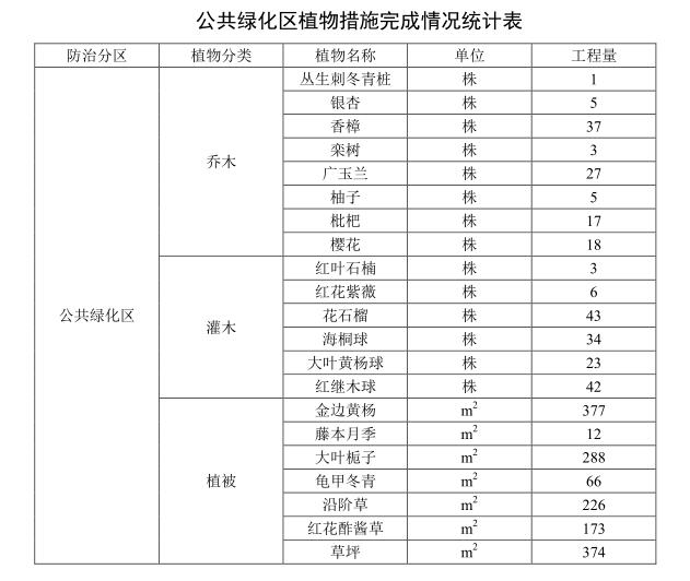 2018年4月至6月,建设单位委托景观绿化公司对公共绿化区进行绿化,绿化以栽植草皮为主,乔灌为辅,乔木主要沿着道路两侧栽植,株距为5.0m;灌木成绿篱状栽植在草皮四周;草皮中央零星点缀小乔木和灌木。乔木主要选择丛生刺冬青桩、银杏、香樟、栾树、广玉兰、柚子、枇杷、樱花;灌木主要选择红叶石楠、红花紫薇、花石榴、海桐球、大叶黄杨球、红继木球等;地被植物选择金边黄杨、藤本月季、大叶栀子、龟甲冬青、沿阶草、红花酢酱草及草坪。 公共绿化区共计栽植乔木113株,栽植灌木151株,铺草皮0.17hm²。 ![]() |